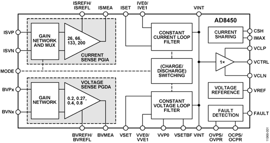 AD8450集成電阻可編程過(guò)壓和過(guò)流檢測(cè)以及均流電路。均流用來(lái)在多個(gè)電池之間平衡電荷。AD8450通過(guò)提供出色的精度、溫度范圍內(nèi)的性能、靈活的功能以及整體可靠性簡(jiǎn)化設(shè)計(jì),并具有節(jié)省空間的封裝。AD8450采用80引腳、14 mm ×14 mm × 1 mm LQFP封裝,額定工作溫度范圍為?40 °C至+85 °C。