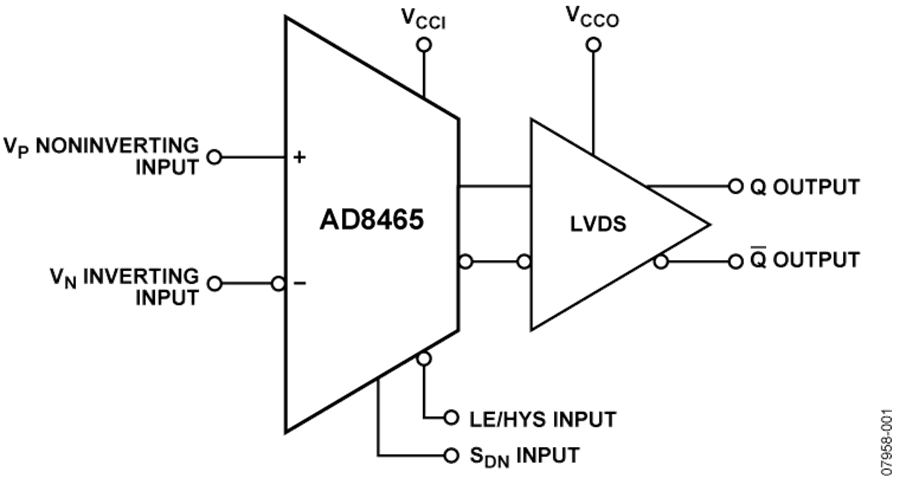 LVDS兼容輸出級旨在驅(qū)動任何標(biāo)準(zhǔn)LVDS輸入。比較器輸入級提供魯棒的較大輸入過驅(qū)保護(hù);當(dāng)輸入超過有效輸入信號范圍時,輸出不會反相。通過獨(dú)特的單引腳控制選項(xiàng),還可提供高速鎖存和可編程遲滯特性。AD8465提供12引腳LFCSP封裝。應(yīng)用