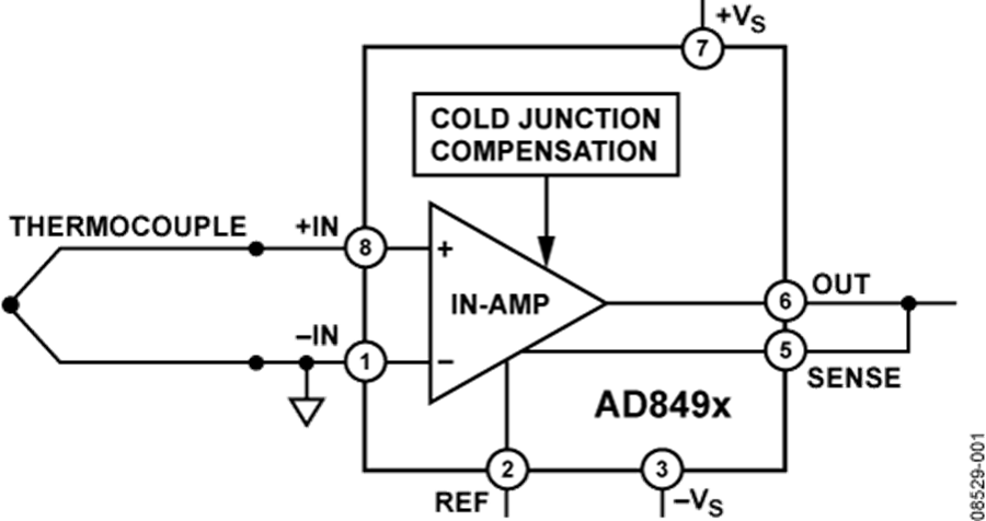 AD8494/AD8495/AD8496/AD8497 均為集成熱電偶冷結(jié)補(bǔ)償器的精密儀表放大器。冰點(diǎn)基準(zhǔn)與預(yù)校準(zhǔn)放大器的結(jié)合,使其能直接從熱電偶信號(hào)產(chǎn)生高電平(5 mV/°C)輸出。這些器件既可以用作獨(dú)立溫度計(jì),也可以用作使用固定或遠(yuǎn)程設(shè)定點(diǎn)控制的開關(guān)輸出設(shè)定點(diǎn)控制器。