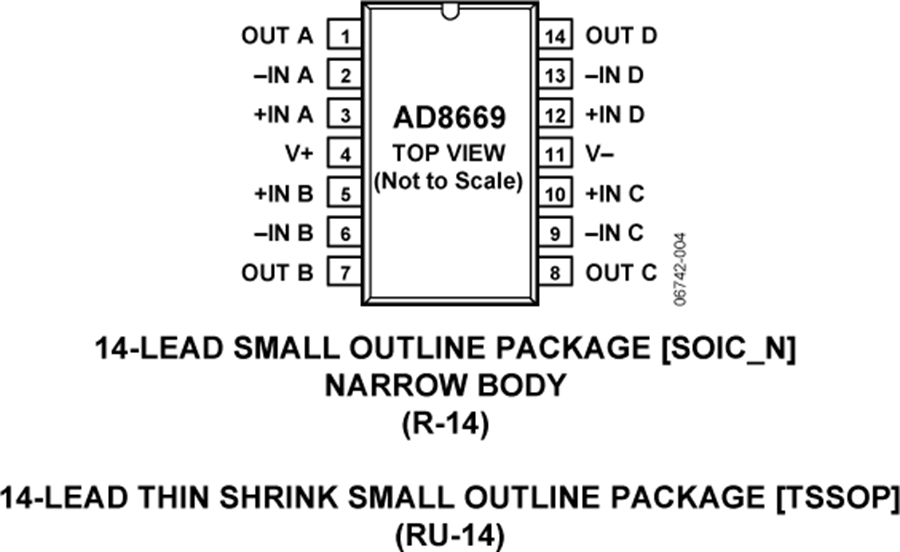 AD8663/AD8667/AD8669的額定溫度范圍為?40°C至+125°C擴(kuò)展工業(yè)溫度范圍。單路AD8663提供窄體8引腳SOIC封裝和超薄8引腳LFCSP封裝。雙通道AD8667提供窄體8引腳SOIC和8引腳MSOP兩種封裝。四通道AD8669提供14引腳小型TSSOP和14引腳SOIC兩種封裝。