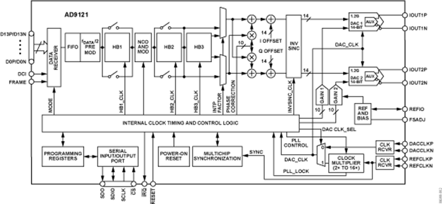 AD9121是一款雙通道、14位、高動(dòng)態(tài)范圍數(shù)模轉(zhuǎn)換器(DAC),提供1230 MSPS采樣速率,可以產(chǎn)生最高達(dá)奈奎斯特頻率的多載波。AD9121 TxDAC+?具有針對(duì)直接變頻傳輸應(yīng)用進(jìn)行優(yōu)化的特性,包括復(fù)數(shù)數(shù)字調(diào)制以及增益與失調(diào)補(bǔ)償。DAC輸出經(jīng)過優(yōu)化,可以與模擬正交調(diào)制器無縫接口,例如ADI公司的ADL537x F-MOD系列調(diào)制器。4線式串行端口接口允許對(duì)許多內(nèi)部參數(shù)進(jìn)行編程和回讀。滿量程輸出電流可以在8.7 mA至31.7 mA范圍內(nèi)進(jìn)行編程。該器件采用72引腳LFCSP封裝。