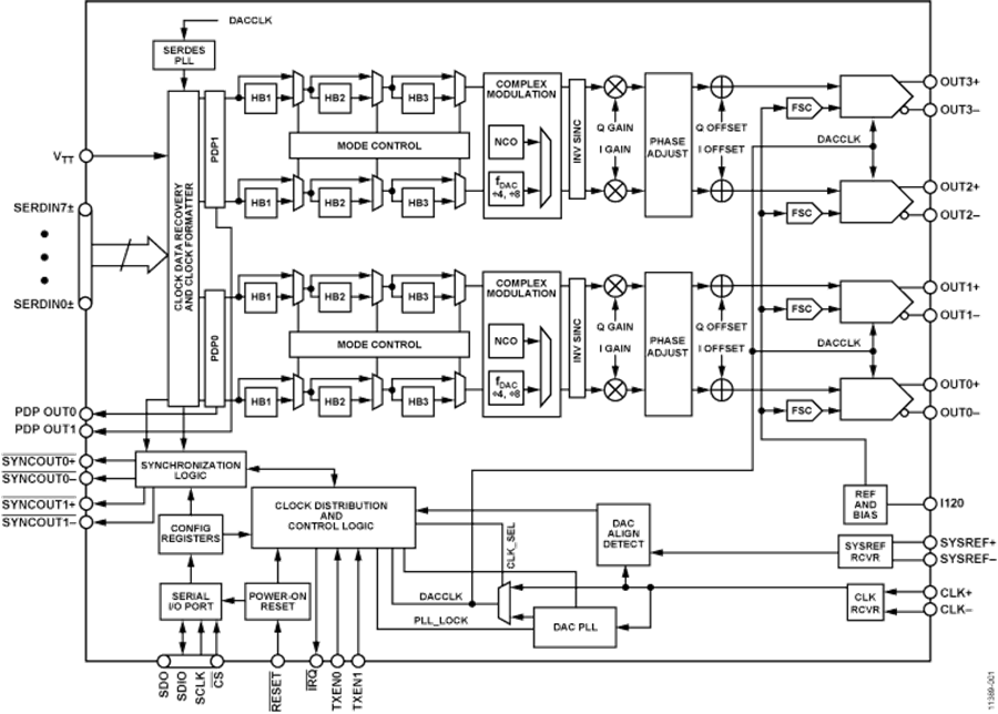 AD9154是一款四通道、16位、高動態(tài)范圍數(shù)模轉換器(DAC),提供2.4 GSPS最高采樣速率,可以在基帶模式下產生高達奈奎斯特頻率的多載波。 AD9154具有針對直接變頻傳輸應用進行優(yōu)化的特性,包括復數(shù)數(shù)字調制、輸入信號功率檢測以及增益、相位與失調補償。 DAC輸出經過優(yōu)化,可以與ADI公司的ADRF672x射頻正交調制器無縫接口。在混頻模式下,DAC可在二階和三階奈奎斯特區(qū)內重構載波。 串行端口接口(SPI)允許對內部參數(shù)進行編程和回讀。 滿量程輸出電流可以在-4 mA至-20 mA范圍內進行編程。 AD9154提供88引腳LFCSP封裝。