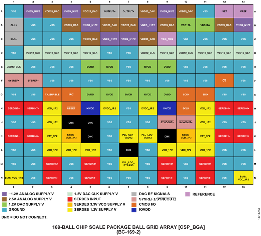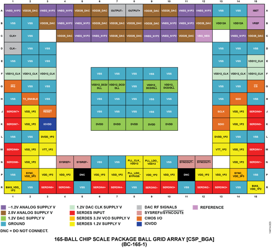 SPI接口可配置AD9164并監(jiān)控所有寄存器的狀態(tài)。AD9164提供165引腳、8 mm × 8 mm、0.5 mm間距CSP_BGA和169引腳、11 mm × 11 mm、0.8 mm間距、CSP_BGA兩種封裝,包括引腳選項(xiàng)。