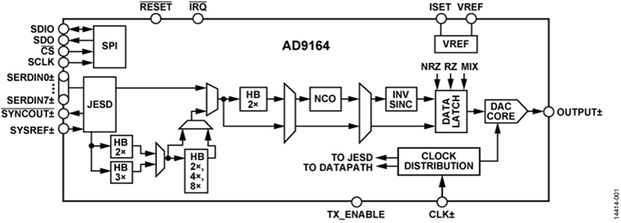 在基帶模式下,元件的寬模擬帶寬能力和高動(dòng)態(tài)范圍相結(jié)合,在最小一個(gè)載波至最大1.791 GHz信號(hào)帶寬的滿量程頻譜范圍內(nèi)可支持DOCSIS 3.1電纜基礎(chǔ)設(shè)施合規(guī)性。2倍插值濾波器(FIR85)使AD9164能夠針對(duì)較低數(shù)據(jù)速率和轉(zhuǎn)換器時(shí)鐘進(jìn)行配置,以降低系統(tǒng)總體功耗和濾波要求。在Mix-Mode?操作模式中,AD9164可在高達(dá)7.5 GHz的二階和三階奈奎斯特區(qū)內(nèi)重構(gòu)RF載波,同時(shí)仍保持出色的動(dòng)態(tài)范圍。輸出電流可以在8 mA至38.76 mA范圍內(nèi)進(jìn)行編程。AD9164數(shù)據(jù)接口由最多八個(gè)JESD204B串行器/解串器(SERDES)通道組成,可對(duì)其通道速度和通道數(shù)進(jìn)行編程,從而實(shí)現(xiàn)應(yīng)用靈活性。
