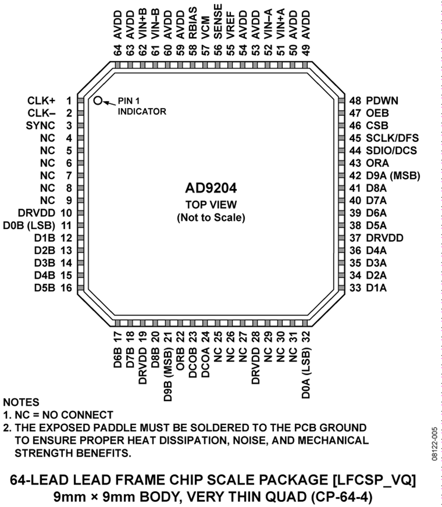 AD9204采用64引腳LFCSP封裝,符合RoHS標(biāo)準(zhǔn),額定溫度范圍為?40°C至+85°C工業(yè)溫度范圍。