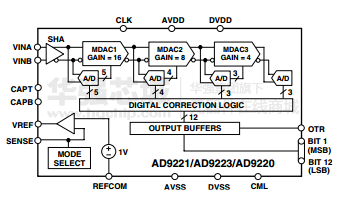 AD9221/AD9223/AD9220采用高速、低成本的單CMOS工藝及新穎的架構(gòu),分辨率和速度均達到現(xiàn)有混合單芯片方案的水平,而功耗與成本卻低得多。每款器件均為完整的單芯片ADC,內(nèi)置片內(nèi)高性能、低噪聲采樣保持放大器和可編程基準電壓源。也可以選用外部基準電壓,以滿足應(yīng)用的直流精度與溫度漂移要求。這些器件采用多級差分流水線架構(gòu),內(nèi)置數(shù)字輸出糾錯邏輯,在額定數(shù)據(jù)速率時可提供12位精度,并保證在整個工作溫度范圍內(nèi)無失碼。