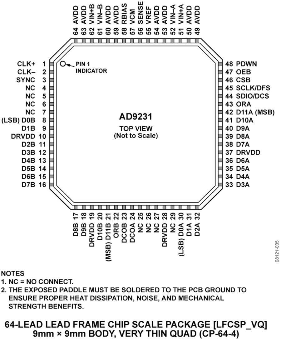 AD9231采用64引腳LFCSP封裝,符合RoHS標準,額定溫度范圍為?40°C至+85°C工業(yè)溫度范圍。