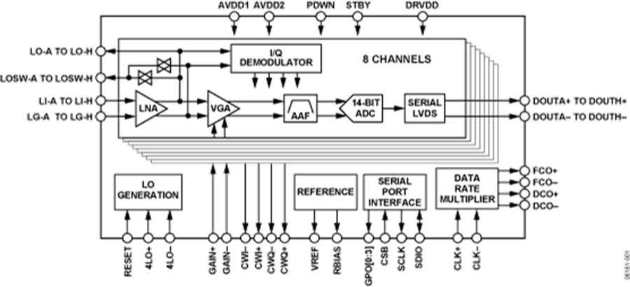 八通道LNA、VGA、AAF、ADC與I/Q解調(diào)器