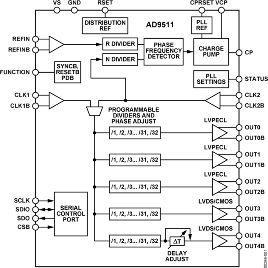 AD9511提供多路輸出時鐘分配功能,并集成一個片內(nèi)鎖相環(huán)(PLL)內(nèi)核。它具有低抖動和低相位噪聲特性,能夠極大地提升數(shù)據(jù)轉(zhuǎn)換器的時鐘性能。3路獨立的LVPECL時鐘輸出和2路LVDS時鐘輸出工作頻率分別為1.2 GHz和800 MHz??蛇x的CMOS時鐘輸出工作頻率為250 MHz。