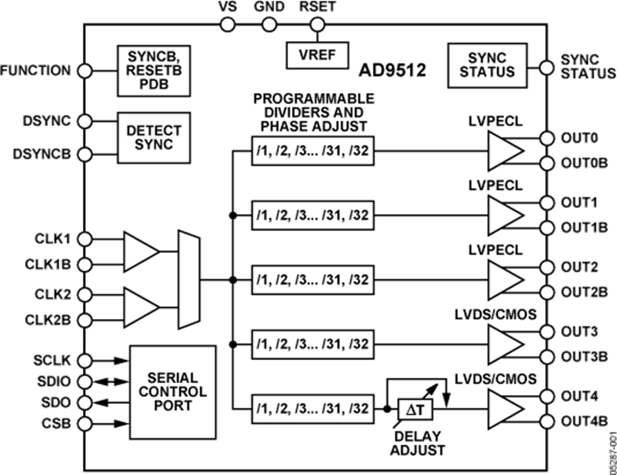 AD9512提供多路輸出時(shí)鐘分配功能,輸入信號(hào)最高可達(dá)1.6 GHz。它具有低抖動(dòng)和低相位噪聲特性,能夠極大地提升數(shù)據(jù)轉(zhuǎn)換器的時(shí)鐘性能。