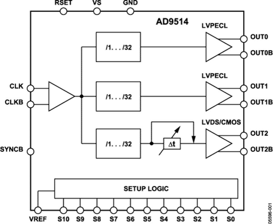 AD9514無需外部控制器即可進(jìn)行操作或設(shè)置。器件通過11個引腳(S0至S10)和4個邏輯電平進(jìn)行編程。編程引腳內(nèi)部偏置為? VS。VREF引腳提供? VS電平。VS(3.3 V)和GND(0 V)提供另外兩個邏輯電平。