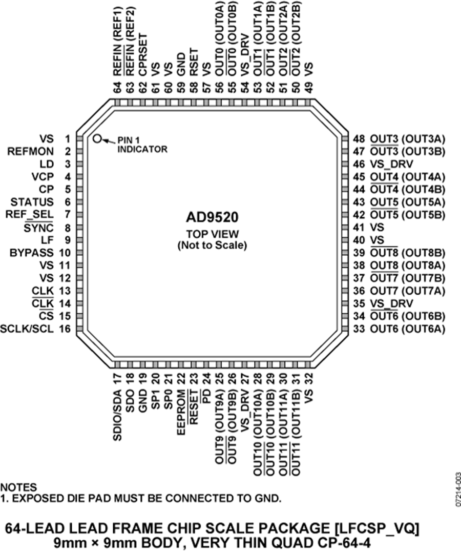AD9520提供64引腳LFCSP封裝,可以采用3.3 V單電源供電。外部VCO的工作電壓最高可達(dá)5.5 V。獨(dú)立的輸出驅(qū)動(dòng)器電源可以為2.375 V至3.465 V。
