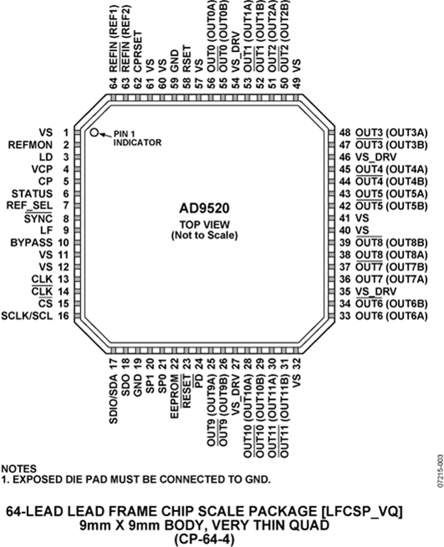 AD9520提供64引腳LFCSP封裝,可以采用3.3 V單電源供電。外部VCO的工作電壓最高可達(dá)5.5 V。獨(dú)立的輸出驅(qū)動(dòng)器電源可以為2.375 V至3.465 V。