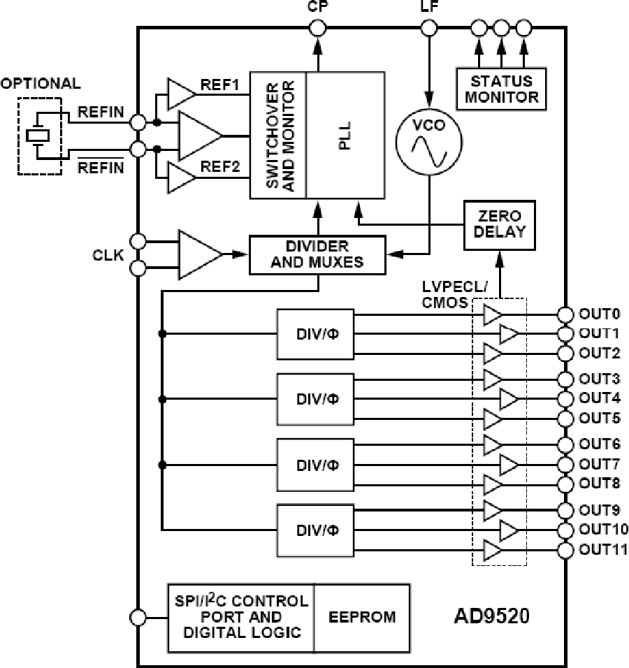AD9520-12提供多路輸出時(shí)鐘分配功能,具有亞皮秒級(jí)抖動(dòng)性能,并且片內(nèi)集成鎖相環(huán)(PLL)和電壓控制振蕩器(VCO)。片內(nèi)VCO的調(diào)諧頻率范圍為2.02 GHz至2.335 GHz。也可以使用最高2.4 GHz的外部3.3 V/5 V VCO/VCXO。
