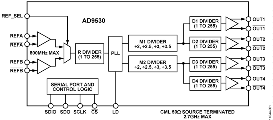 AD9530是一款針對40 Gbps/ 100 Gbps OTN應(yīng)用的完全集成式PLL和分配器件,支持時鐘清零和頻率轉(zhuǎn)換。內(nèi)部PLL可鎖定至兩個參考頻率之一以生成最高達(dá)2.7 GHz的四個離散輸出頻率。