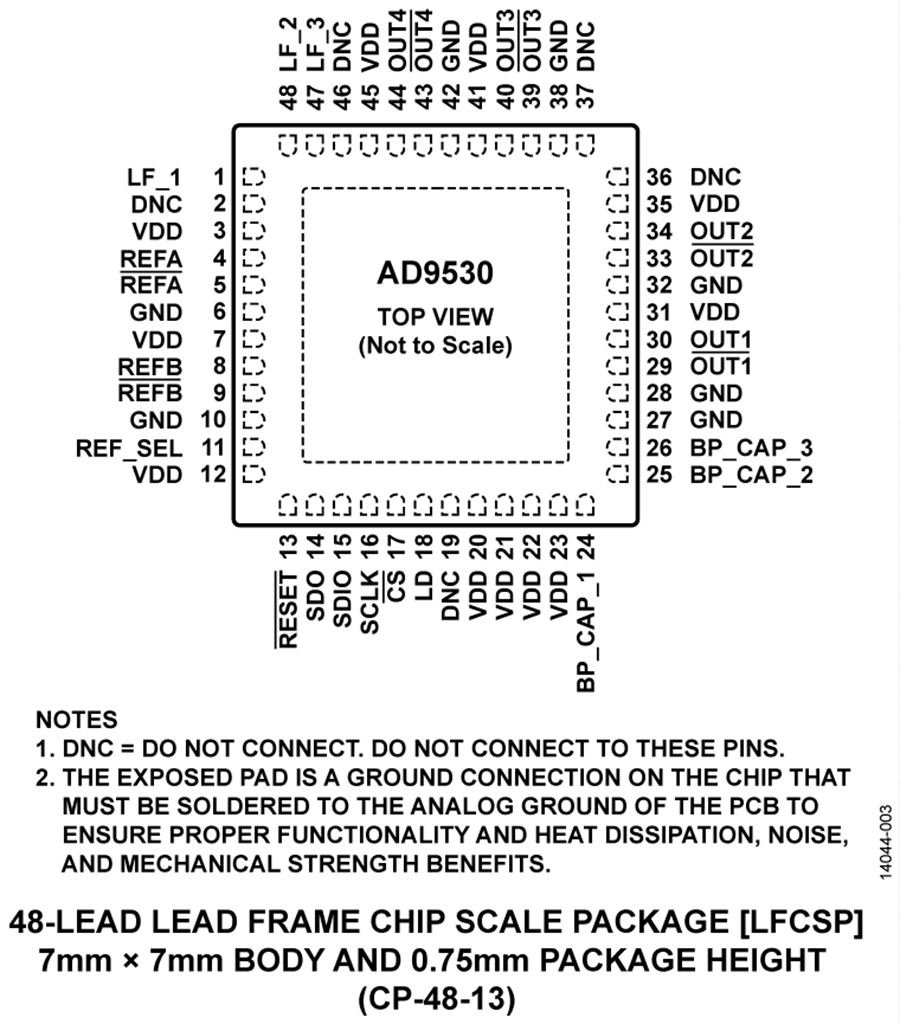 AD9530提供48引腳LFCSP封裝,采用典型2.5 V單電源供電。