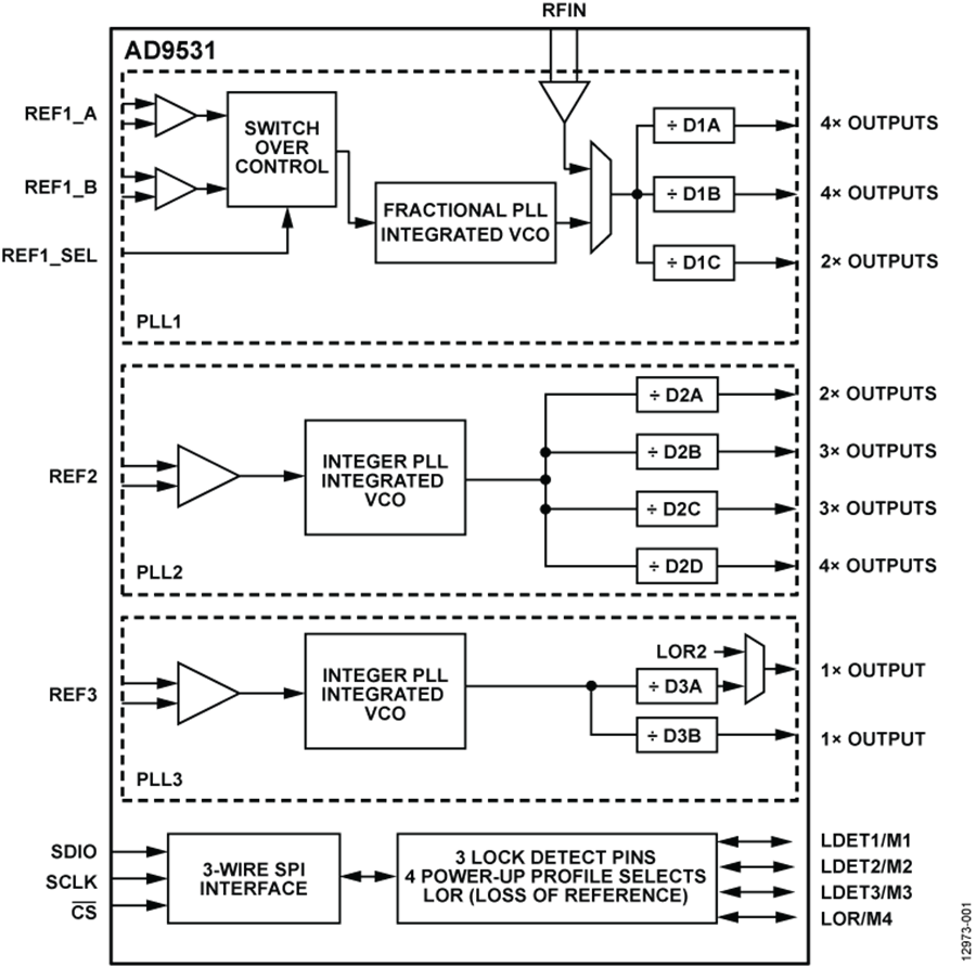 AD9531提供一個(gè)多路輸出時(shí)鐘發(fā)生器和三個(gè)具有可編程輸出頻率和格式的片上鎖相環(huán)內(nèi)核(PLL)內(nèi)核。