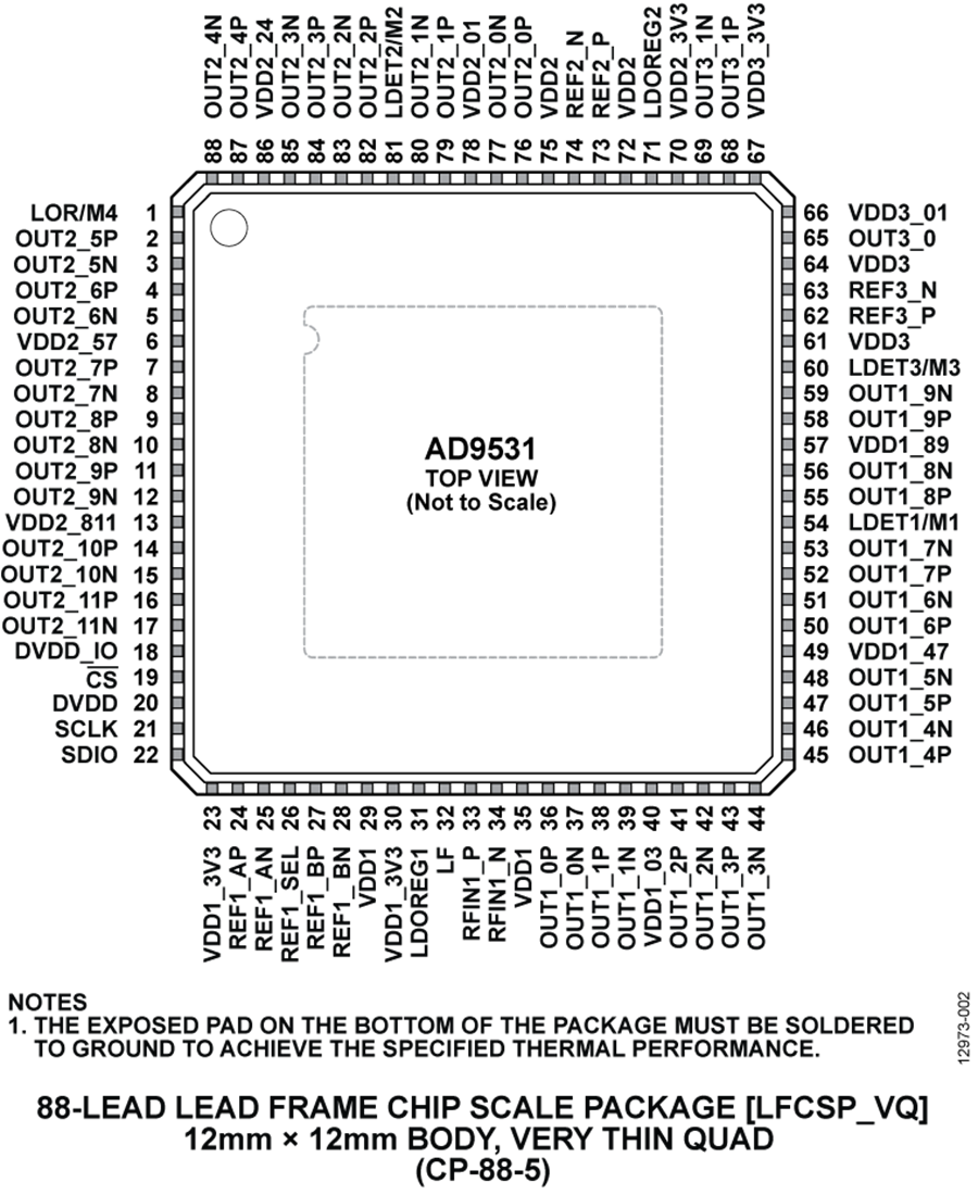 AD9531采用88引腳LFCSP封裝,額定工作溫度范圍為?40°C至+85°C。
