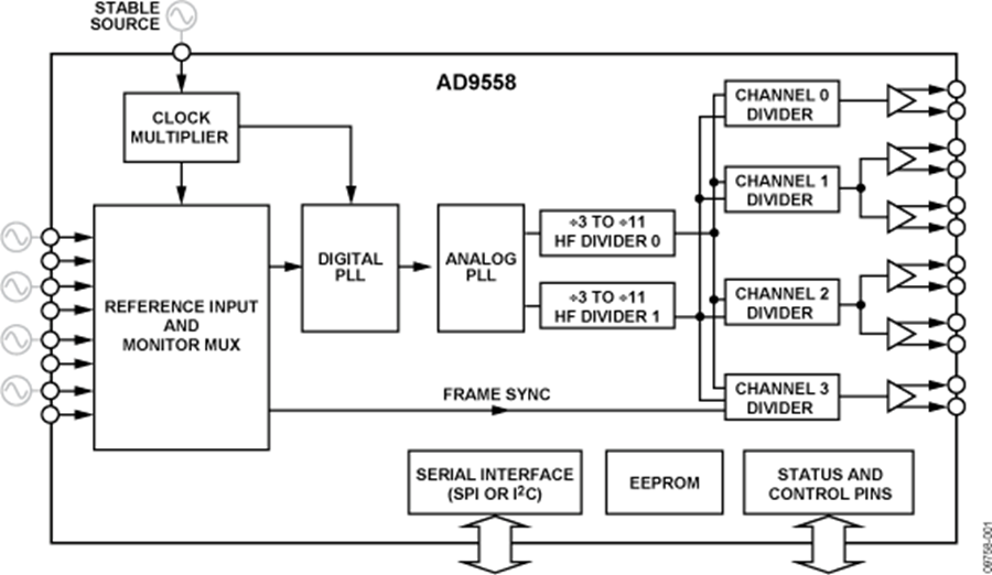 AD9558針對(duì)許多系統(tǒng)提供同步功能,包括同步以太網(wǎng)(SyncE)和同步光纖網(wǎng)絡(luò)(SONET/SDH)。AD9558可產(chǎn)生與最多四個(gè)外部輸入?yún)⒖紩r(shí)鐘之一同步的輸出時(shí)鐘。數(shù)字鎖相環(huán)(PLL)可以降低與外部參考時(shí)鐘相關(guān)的輸入時(shí)間抖動(dòng)或相位噪聲。借助數(shù)字控制環(huán)路和保持電路,即使所有基準(zhǔn)時(shí)鐘都已失效,AD9558也可以連續(xù)產(chǎn)生干凈(低抖動(dòng))、有效的輸出時(shí)鐘。