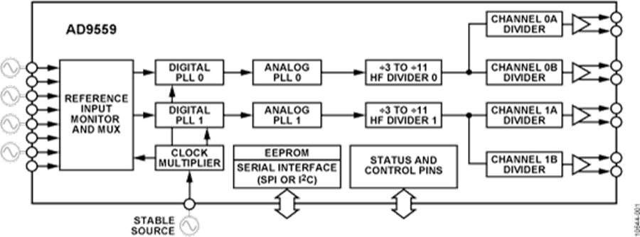 AD9559是一款低環(huán)路帶寬時(shí)鐘倍頻器,可針對(duì)包括同步光纖網(wǎng)絡(luò)(SONET/SDH)的許多系統(tǒng)提供抖動(dòng)清除和同步功能。AD9559產(chǎn)生的輸出時(shí)鐘可以與多達(dá)四路外部輸入?yún)⒖紩r(shí)鐘同步。DPLL可以降低與外部參考時(shí)鐘相關(guān)的輸入時(shí)間抖動(dòng)或相位噪聲。借助數(shù)字控制環(huán)路和保持電路,即使所有參考輸入都失效,AD9559也能持續(xù)產(chǎn)生低抖動(dòng)輸出時(shí)鐘。