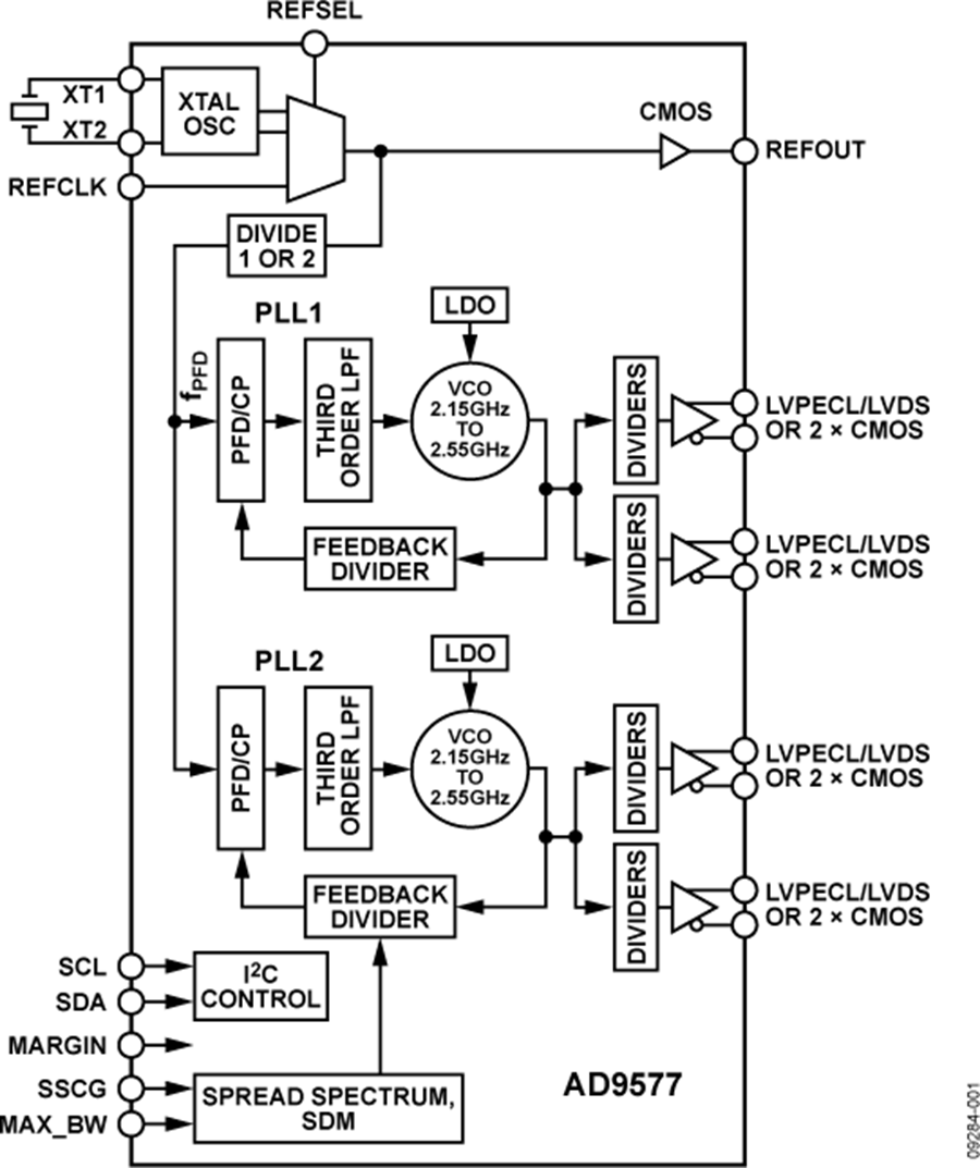 AD9577既提供一個多路輸出時鐘發(fā)生器功能,又帶有兩個片上鎖相環(huán)內(nèi)核PLL1和PLL2,專門針對網(wǎng)絡(luò)時鐘應(yīng)用而優(yōu)化。PLL設(shè)計基于ADI公司成熟的高性能、低抖動頻率合成器產(chǎn)品系列,確保實現(xiàn)最高的網(wǎng)絡(luò)性能。PLL具有I2C 可編程輸出頻率和格式。小數(shù)N分頻PLL可支持擴頻時鐘功能,降低EMI輻射的峰值功率。兩個PLL均可支持頻率余量微調(diào)功能。第一個整數(shù)N分頻PLL部分(PLL1)由一個鑒頻鑒相器(PFD)、一個電荷泵(CP)、一個低噪聲電壓控制振蕩器(VCO)、一個可編程反饋分頻器和兩個獨立可編程輸出分頻器組成。通過將外部晶振或基準時鐘連接至REFCLK引腳,可將最高達637.5 MHz的頻率同步至輸入基準。針對所需輸出速率,每個輸出分頻器和反饋分頻器的比率可以是工廠設(shè)定或I2C 編程設(shè)定。
