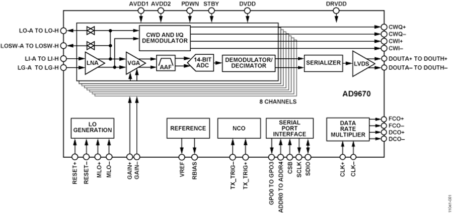 8通道LNA、VGA、抗混疊濾波器、ADC與數(shù)字解調(diào)器/抽取濾波器