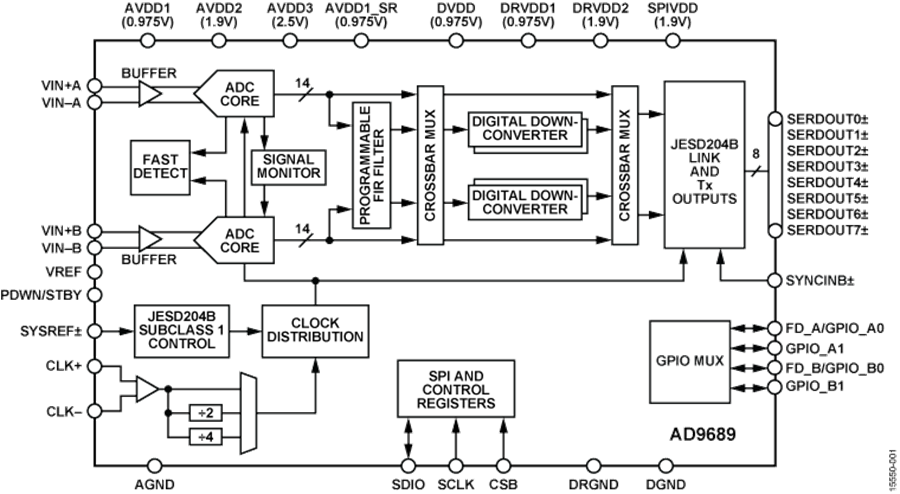 AD9689 還提供了靈活的功耗減低選項(xiàng),可以在必要時(shí)大幅度降低功耗。所有這些功能均可通過(guò)一個(gè) 3 線串口接口 (SPI) 進(jìn)行編程。