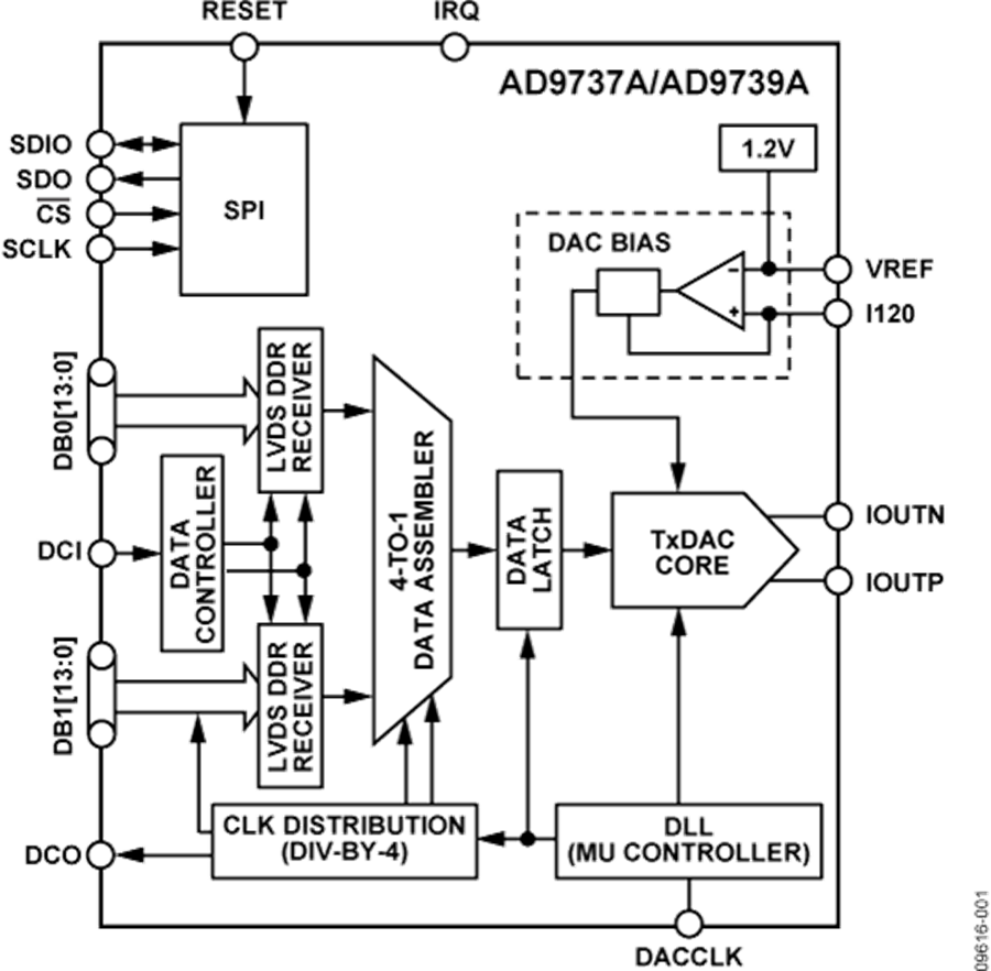 內(nèi)置片內(nèi)控制器使系統(tǒng)集成得以簡化。 雙端口源同步LVDS接口簡化了與現(xiàn)有FGPA/ASIC技術(shù)的數(shù)字接口。 片內(nèi)控制器用于管理外部和內(nèi)部時(shí)鐘域隨溫度而發(fā)生的變化,以確保主機(jī)與DAC內(nèi)核間的可靠數(shù)據(jù)傳輸。 此外還提供一個(gè)串行外設(shè)接口(SPI),用于器件配置和狀態(tài)寄存器回讀。
