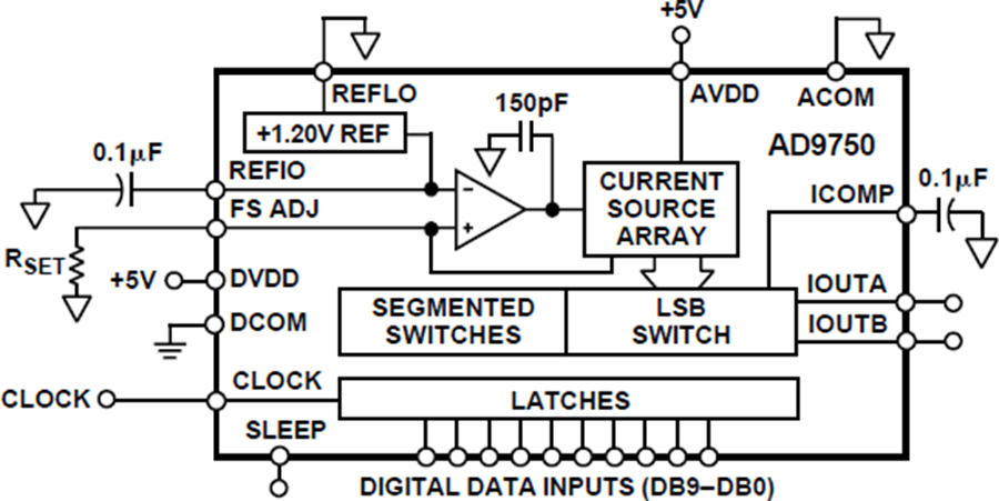 AD9750屬于TxDAC系列高性能、低功耗CMOS數(shù)模轉(zhuǎn)換器(DAC)的第二代10位分辨率產(chǎn)品。TxDAC系列由引腳兼容的8、10、12、14位DAC組成,并專門針對通信系統(tǒng)的發(fā)射信號路徑進行了優(yōu)化。所有器件都采用相同的接口選項、小型封裝和引腳排列,因而可以根據(jù)性能、分辨率和成本,向上或向下選擇適合的器件。AD9750提供出色的交流和直流性能,同時支持最高125 MSPS的更新速率。