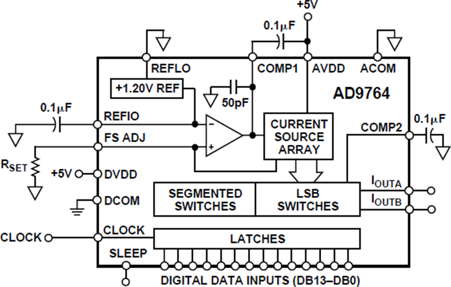 片內(nèi)、邊沿觸發(fā)輸入CMOS鎖存可以輕松與+3 V和+5 V CMOS邏輯系列接口。AD9764支持高達125 MSPS的更新速率。