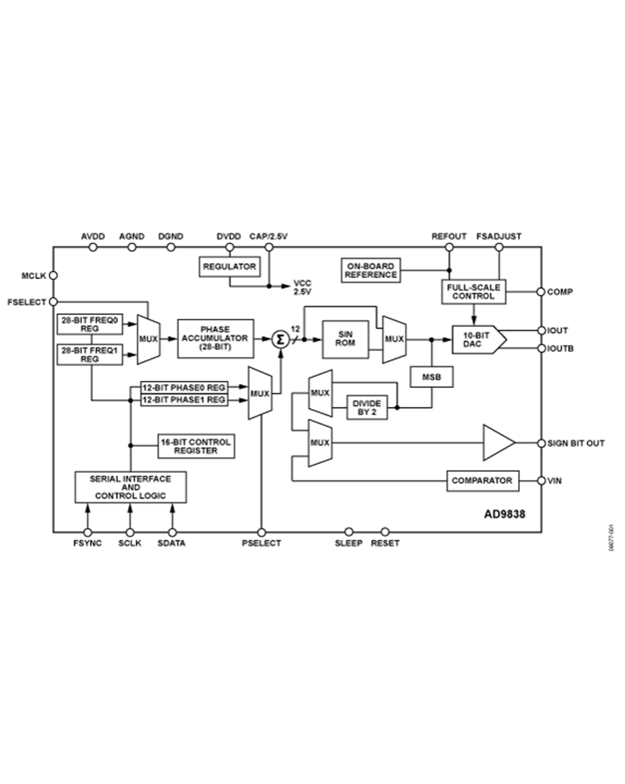 AD9838具有關斷引腳(SLEEP),支持從外部控制關斷模式。器件中不用的部分可以關斷,以將功耗降至最低。例如,在產生時鐘輸出時,可以關斷DAC。