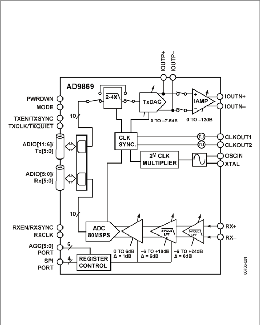 該器件非常適合半雙工和全雙工應(yīng)用。該數(shù)字接口極為靈活,可與支持半雙工或全雙工數(shù)據(jù)傳輸?shù)臄?shù)字后端實(shí)現(xiàn)簡單接口,因此AD9869經(jīng)常用來取代分立式ADC和DAC解決方案。省電模式能夠降低個(gè)別功能模塊的功耗,或者在半雙工應(yīng)用中關(guān)斷未使用的模塊。串行端口接口(SPI)允許對許多功能模塊進(jìn)行軟件編程。片內(nèi)PLL時(shí)鐘乘法器和頻率合成器提供所有需要的內(nèi)部時(shí)鐘,以及單晶振或時(shí)鐘源的外部時(shí)鐘。