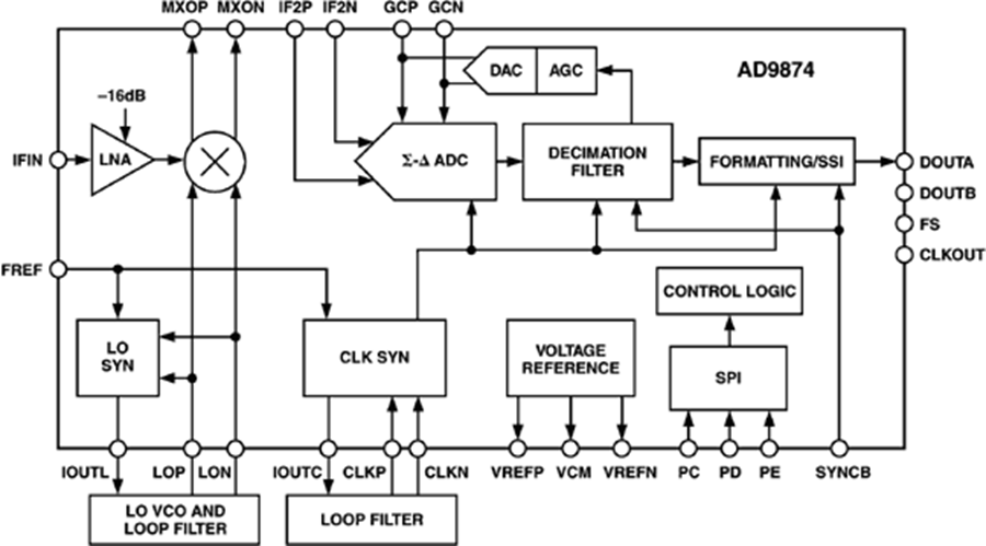 AD9874是一款通用中頻子系統(tǒng),可對(duì)帶寬最高至270 kHz的低電平10至300 MHz中頻輸入信號(hào)進(jìn)行數(shù)字處理。AD9874的信號(hào)鏈包括一個(gè)低噪聲放大器、混頻器、一個(gè)帶通Σ-Δ型模數(shù)轉(zhuǎn)換器以及一個(gè)具有可編程抽取系數(shù)的抽取濾波器。自動(dòng)增益控制(AGC)電路提供12 dB的連續(xù)增益調(diào)整。高動(dòng)態(tài)范圍和帶通Σ-Δ型轉(zhuǎn)換器內(nèi)在的抗混疊功能,使該器件能處理比目標(biāo)信號(hào)強(qiáng)度高達(dá)95 dB的阻塞信號(hào)。除串行外設(shè)接口端口外,輔助模塊還包括時(shí)鐘和LO頻率合成器。