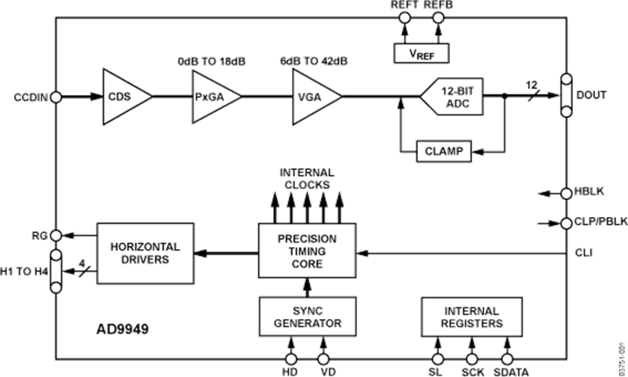 AD9949是一款高度集成的CCD信號(hào)處理器,適用于數(shù)碼相機(jī)應(yīng)用。該器件由帶模數(shù)轉(zhuǎn)換功能的完整模擬前端和可編程的時(shí)序驅(qū)動(dòng)器組成,額定像素速率最高可達(dá)36 MHz。Precision Timing內(nèi)核允許以600 ps以下的分辨率調(diào)整高速時(shí)鐘。模擬前端包括黑色電平箝位、CDS、PxGA、VGA和一個(gè)36 MSPS 12位ADC。時(shí)序驅(qū)動(dòng)器為RG和H1–H4提供高速CCD時(shí)鐘驅(qū)動(dòng)器。此外,可通過三線式串行接口進(jìn)行編程。