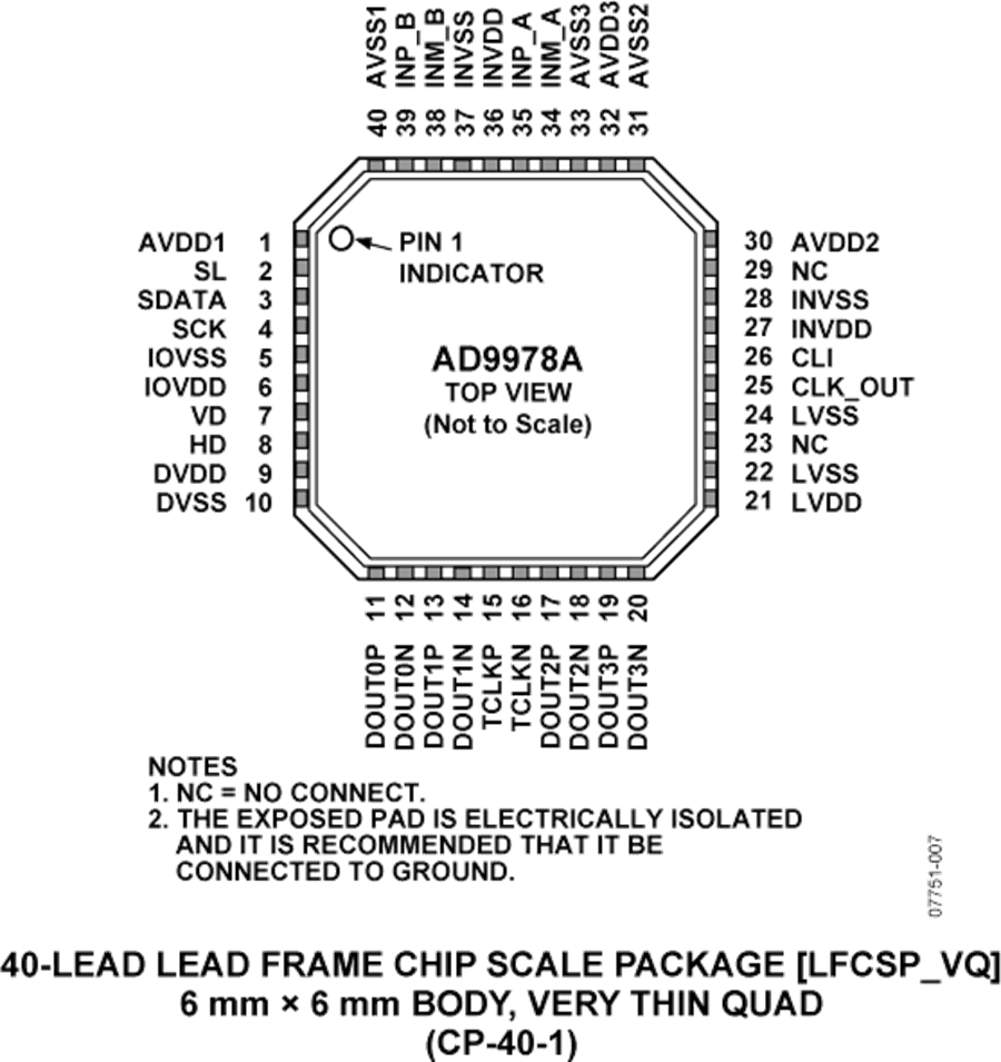 AD9978A采用節(jié)省空間的6 mm × 6 mm、40引腳LFCSP封裝,額定工作溫度范圍為?25°C至+85°C。