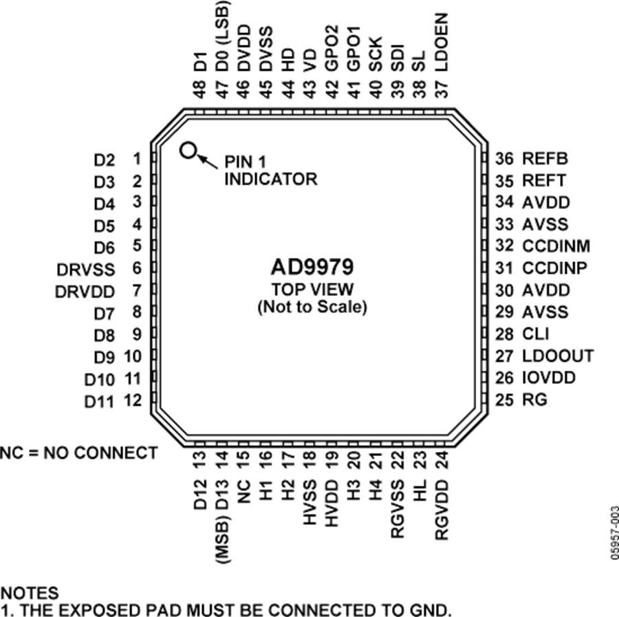 AD9979采用節(jié)省空間的7 mm × 7 mm、48引腳LFCSP封裝,額定工作溫度范圍為?25°C至+85°C。