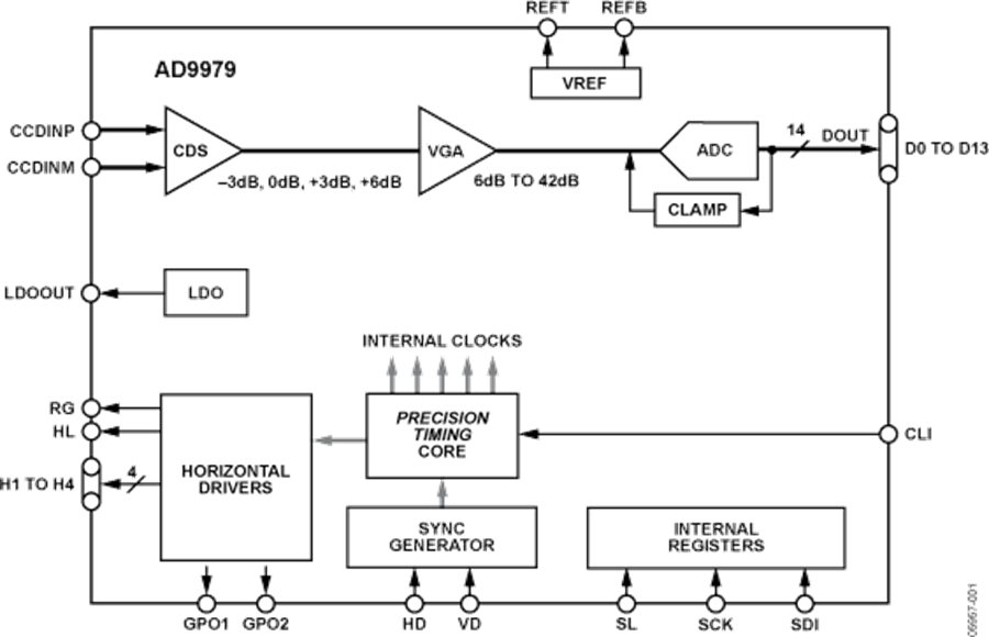 AD9979是一款高度集成的CCD信號(hào)處理器,適用于高速數(shù)碼攝像機(jī)應(yīng)用。該器件由具有模數(shù)轉(zhuǎn)換功能的完整模擬前端和可編程的時(shí)序驅(qū)動(dòng)器組成,額定像素率最高可達(dá)65 MHz。在65 MHz下工作時(shí),Precision Timing 內(nèi)核允許以大約240 ps的分辨率調(diào)整高速時(shí)鐘。模擬前端包括黑色電平箝位、CDS、VGA和一個(gè)65 MSPS、14位模數(shù)轉(zhuǎn)換器(ADC)。時(shí)序驅(qū)動(dòng)器為RG、HL和H1至H4提供高速CCD時(shí)鐘驅(qū)動(dòng)器。此外,該器件可通過三線式串行接口進(jìn)行編程。