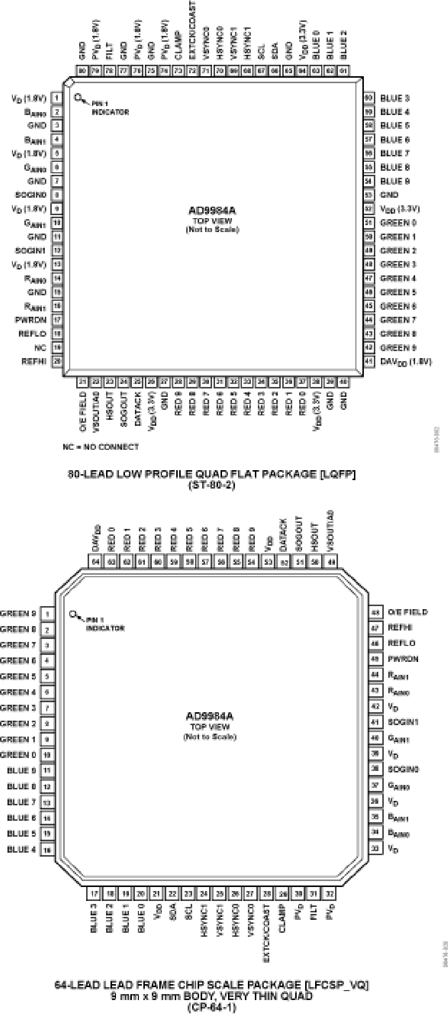 AD9984A采用先進(jìn)的CMOS工藝制造,提供80引腳、無鉛、薄型四方扁平封裝(LQFP)或64引腳架構(gòu)芯片級封裝(LFCSP),節(jié)省空間;額定溫度范圍為0°C至70°C。