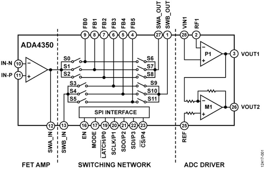 ADA4350集成了FET輸入放大器、切換網(wǎng)絡(luò)和ADC驅(qū)動器,所有功能均可通過串行外設(shè)接口(SPI)或單個IC中的并行控制邏輯控制。 FET輸入放大器具有極低的電壓噪聲和電流噪聲,極其適合各種光電檢測器、傳感器或精密數(shù)據(jù)采集系統(tǒng)。