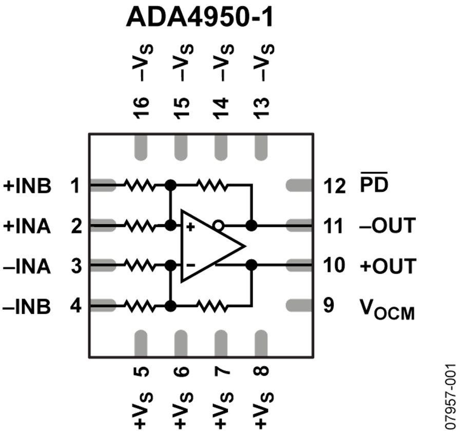 ADA4950-x采用3mm×3mm 16引腳的無鉛LFCSP封裝(ADA4950-1,單路),或者4 mm×4 mm 24引腳的無鉛LFCSP封裝(ADA4950-2,雙路)。引腳分布已經(jīng)過優(yōu)化,以便于進(jìn)行PCB布局,并最大限度地降低失真。ADA4950-1/ADA4950-2的額定工作溫度范圍均為?40℃至+105℃;都采用+3 V至±5 V電源供電。