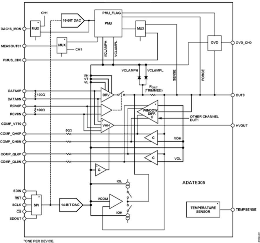 ADATE305是一款完整的單芯片解決方案,用于在ATE應(yīng)用中執(zhí)行驅(qū)動器、比較器和有源負(fù)載(DCL)、單引腳(Per Pin) PMU、直流電平的引腳電子功能。它還內(nèi)置一個HVOUT驅(qū)動器和VHH緩沖器,能夠產(chǎn)生最高13.5 V的電壓。