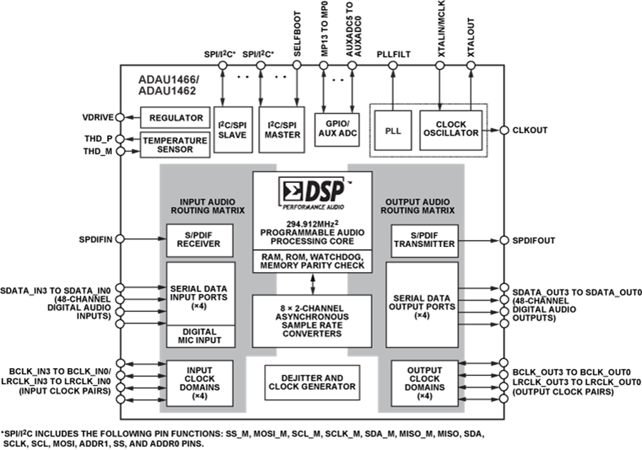 ADAU1462/ADAU1466 接口可連接各種模數(shù)轉(zhuǎn)換器 (ADC)、數(shù)模轉(zhuǎn)換器 (DAC)、數(shù)字音頻器件、放大器和控制電路,包括高配置的串行端口、I2C、串行外設(shè)接口 (SPI)、Sony/Philips Digital Interconnect Format (S/PDIF) 接口,以及多用途輸入/輸出 (I/O) 引腳。專用的抽取濾波器最多可對(duì) 4 個(gè) MEMS 麥克風(fēng)的脈沖編碼調(diào)制 (PDM) 輸出進(jìn)行解碼。