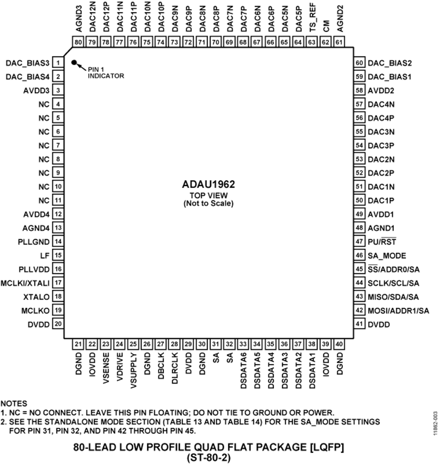 ADAU1962采用80引腳LQFP封裝。請(qǐng)注意,在整篇數(shù)據(jù)手冊(cè)中,多功能引腳(如SCLK/SCL/SA)由整個(gè)引腳名稱或引腳的單個(gè)功能表示;例如SCLK即表示僅與此功能相關(guān)。