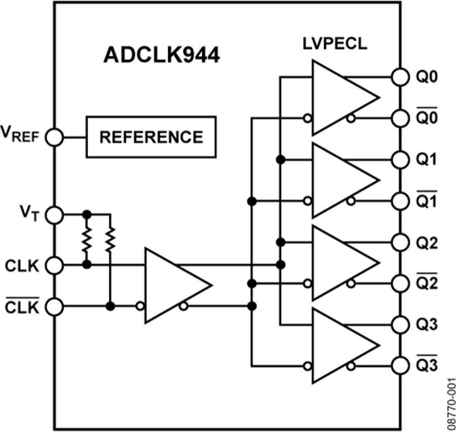 ADCLK944是一款超快型時鐘扇出緩沖器,采用ADI公司專有的XFCB3硅鍺(SiGe)雙極性工藝制造。這款器件設(shè)計用于要求低抖動性能的高速應(yīng)用。該器件具有一路配中心抽頭、差分、100 Ω片內(nèi)端接電阻的差分輸入,支持直流耦合LVPECL、CML、3.3 V CMOS(單端)輸入和交流耦合1.8 V CMOS、LVDS、LVPECL輸入。 VREF 引腳可用來為交流耦合輸入提供偏置。