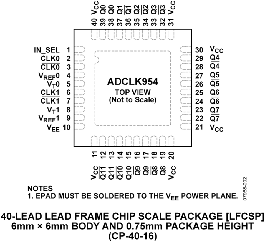 ADCLK954采用40引腳LFCSP封裝,額定工作溫度范圍為?40℃至+85℃的標(biāo)準(zhǔn)工業(yè)溫度范圍。