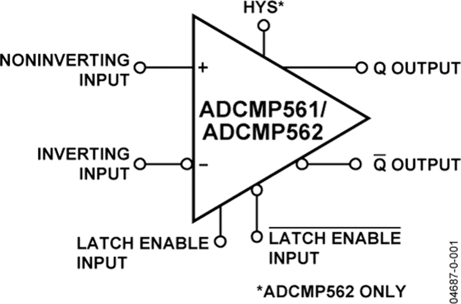 ADCMP561/ADCMP562均為高速比較器,采用ADI公司的專(zhuān)有XFCB工藝制造。這些器件的傳播延遲為1 ns,過(guò)驅(qū)消散小于150 ps。消散是對(duì)不同過(guò)驅(qū)條件下傳播延遲差異的量度,它是高速比較器的一個(gè)特別重要的特性。ADCMP562上提供單獨(dú)的可編程遲滯引腳。