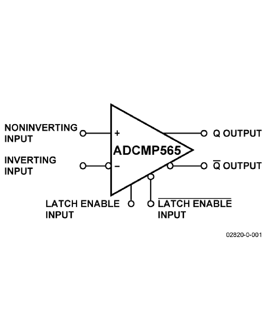 ADCMP565是一款超快型電壓比較器,采用ADI的專有XFCB工藝制造。該器件的傳播延遲為300 ps,過驅(qū)消散小于50 ps。過驅(qū)消散是對不同過驅(qū)條件下傳播延遲差異的量度,它是高速比較器的一個(gè)特別重要的特性。快速、高精度差分輸入級(jí)使各種信號(hào)的傳播延遲可以保持一致,共模范圍為-2.0 V至+3.0 V。輸出為互補(bǔ)數(shù)字信號(hào),與ECL 10 K和10 KH邏輯系列完全兼容。這些輸出提供充足的驅(qū)動(dòng)電流,可直接驅(qū)動(dòng)采用50 ?電阻端接至–2 V的傳輸線路。該器件還提供鎖存輸入,并可采用跟蹤、跟蹤保持或采樣保持工作模式。