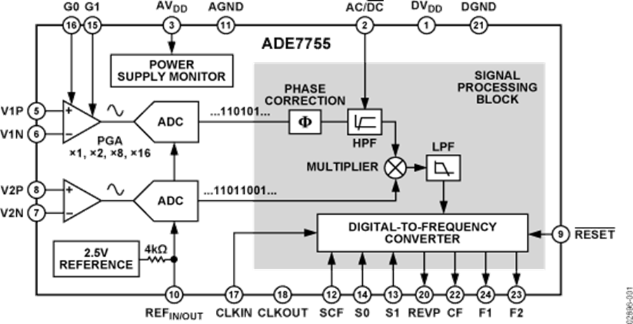 ADE7755是一款高精度、電能計(jì)量IC。 該產(chǎn)品的技術(shù)規(guī)格超越了IEC 1036標(biāo)準(zhǔn)所列的精度要求。ADE7755采用的唯一模擬電路是ADC和基準(zhǔn)電壓源電路。 所有其它信號處理(例如,乘法和濾波)都在數(shù)字域中實(shí)現(xiàn)。 這種方式能夠始終在極端環(huán)境條件下提供出色的穩(wěn)定性和精度。