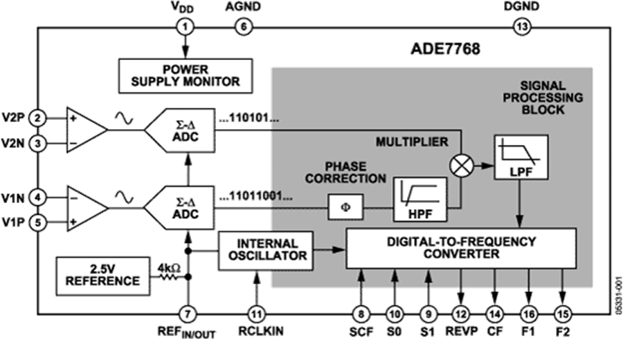 ADE7768可提供基于輸電線電壓和電流計(jì)算的瞬時(shí)有功功率和平均有功功率,并且僅累積正功率 - 忽略負(fù)功率。該器件規(guī)范超過IEC61036標(biāo)準(zhǔn)規(guī)定的精度要求。ADE7768中使用的唯一模擬電路是ADC和參考電壓電路。所有其它信號(hào)處理(例如乘法和濾波)都是在數(shù)字域?qū)崿F(xiàn)的。這種信號(hào)處理方法可在隨環(huán)境條件和時(shí)間變化的很大范圍內(nèi)提供優(yōu)異的穩(wěn)定性和精度。