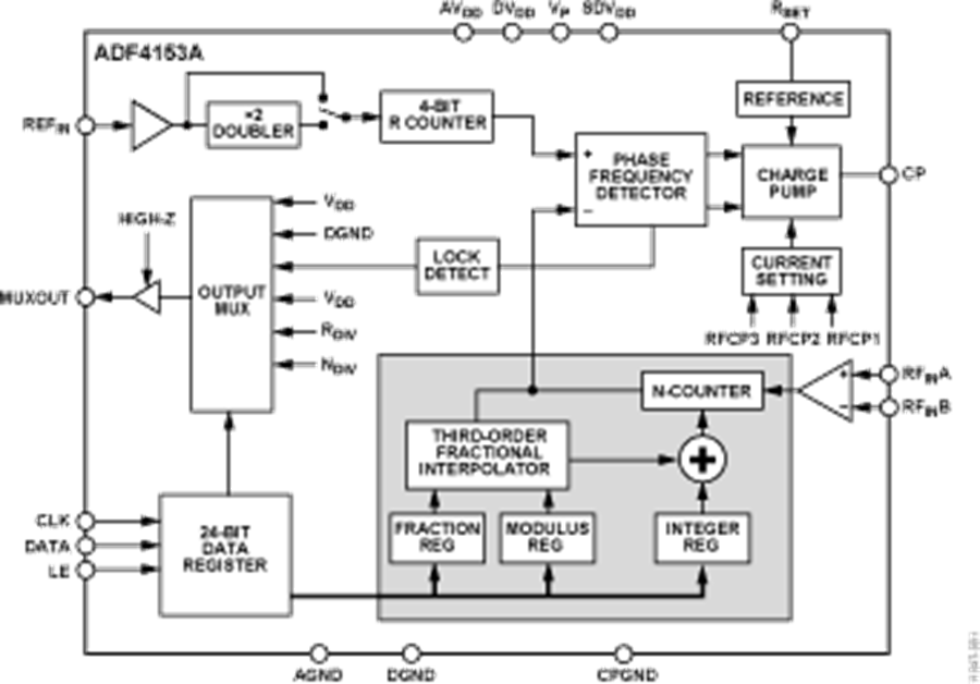 ADF4153A是一款小數(shù)N分頻頻率合成器,用來在無線接收機和發(fā)射機的上變頻和下變頻部分實現(xiàn)本振。它由低噪聲數(shù)字鑒頻鑒相器(PFD)、精密電荷泵和可編程參考分頻器組成。該器件內(nèi)置一個Σ-Δ型小數(shù)插值器,能夠?qū)崿F(xiàn)可編程模數(shù)小數(shù)N分頻。INT、FRAC和MOD寄存器可構(gòu)成一個總N分頻器(N = (INT + (FRAC/MOD)))。此外,4位參考分頻器(R分頻器)允許PFD輸入端的REFIN頻率為可選值。如果頻率合成器與外部環(huán)路濾波器和電壓控制振蕩器(VCO)一起使用,則可以實現(xiàn)完整的鎖相環(huán)(PLL)。簡單的三線式接口控制所有片內(nèi)寄存器。該器件采用2.7 V至3.3 V電源供電,不用時可以關(guān)斷。